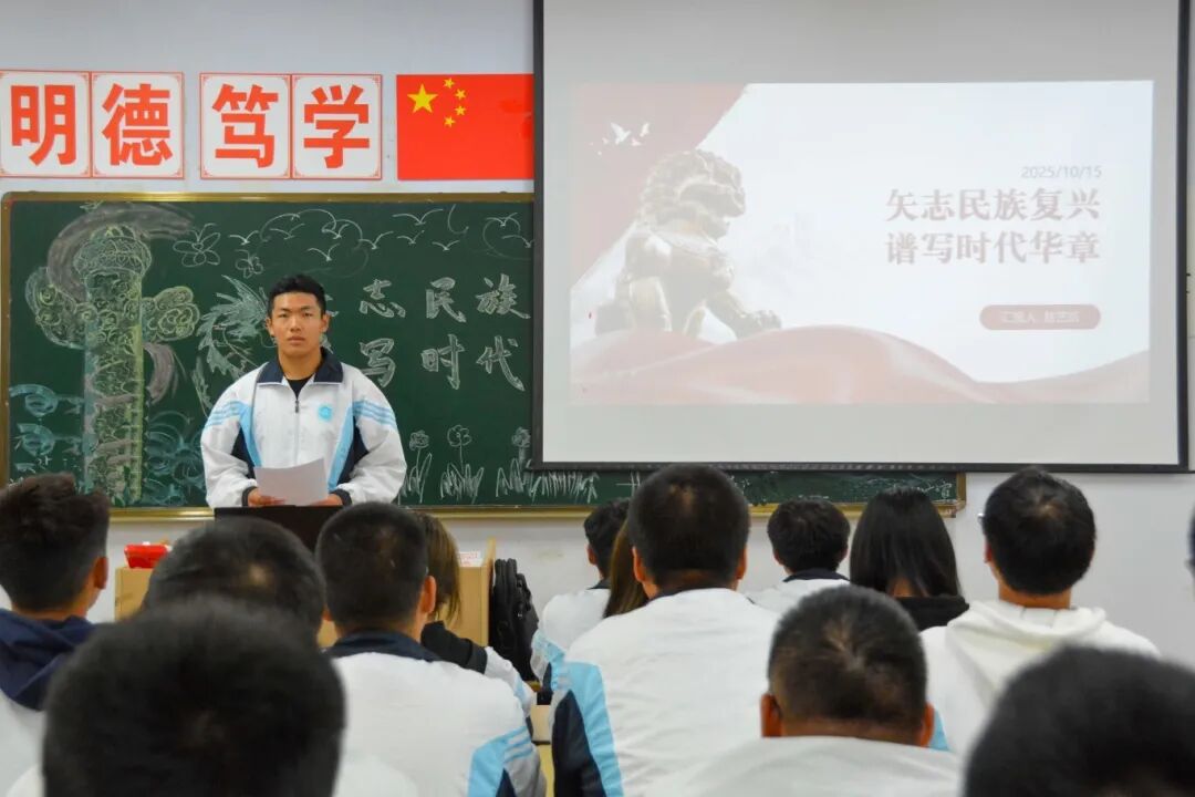 团会现场,历史回响与时代使命交融共鸣。电2503班石恩瑜同学以“从嘉兴红船到开国大典”为主线,讲述了革命先辈“为民族谋复兴、为人民谋幸福”的初心故事,使同学们深刻体会到“民族复兴”并非抽象的口号,而是一代代人接续奋斗的坚定信仰;随后水2501班王宝玉同学则结合脱贫攻坚、航天科研等新时代青年事迹,展现从“前辈奠基”到“青年接棒”的使命传承。